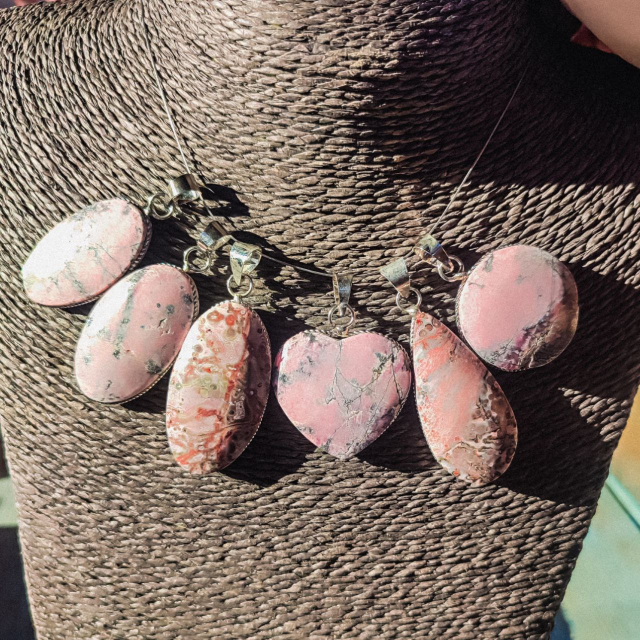 Colgante de rodonita engarzado en alpaca con baño de plata que deja brillar toda la belleza de la piedra. Esta gema rosada es la compañera perfecta para quienes buscan fortalecer el amor y la amistad. La rodonita equilibra el chakra del corazón, despierta sentimientos de compasión y perdón, y ayuda a sanar esas heridas emocionales que llevamos guardadas. Además, es experta en calmar la ansiedad y transformar esos sentimientos negativos en paz interior. Un talismán delicado que te recuerda que el amor y la aceptación siempre merecen una segunda oportunidad.