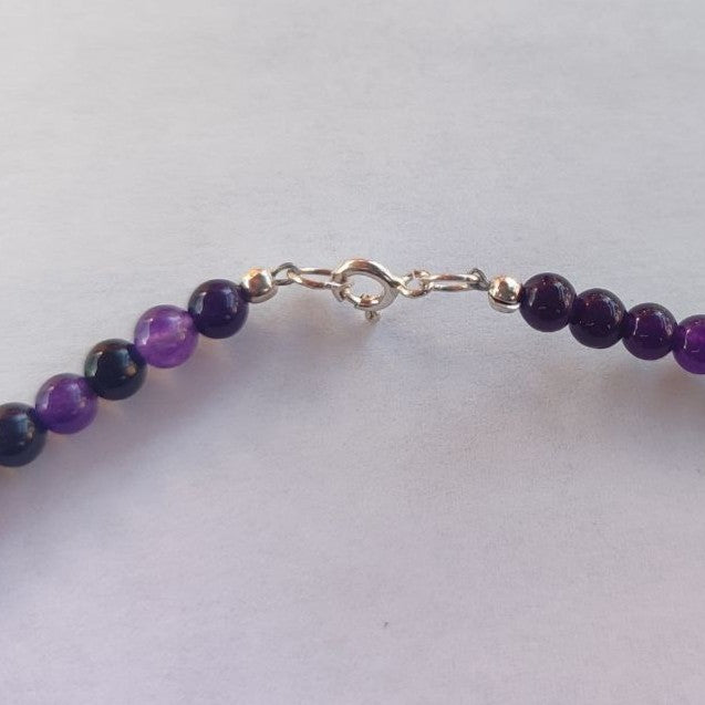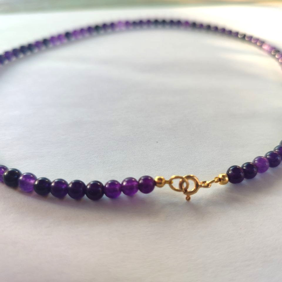 Collar Raíz de amatistas Envuélvete en la magia violeta con este collar de 45 cm que combina amatistas de 4, 6 y 8 mm en una composición armoniosa. Elige tu acabado favorito: cierre en plata de ley para un toque clásico o plata bañada en oro para un brillo más cálido. La amatista es tu aliada protectora y tranquilizante natural. Esta piedra poderosa bloquea energías negativas, potencia tu memoria y motivación, y te ayuda a encontrar el sentido común en momentos de confusión. Perfecta para meditar, asimilar nuevas ideas y conectar tus cuerpos físico, mental y emocional con lo espiritual. ¿Buscas alivio del estrés? La amatista combate el insomnio y regala un sueño reparador. Además, limpia tu aura, transmuta energías negativas y estimula los chacras de la garganta y coronilla. Un collar que no es solo joya, sino tu compañero energético del día a día.