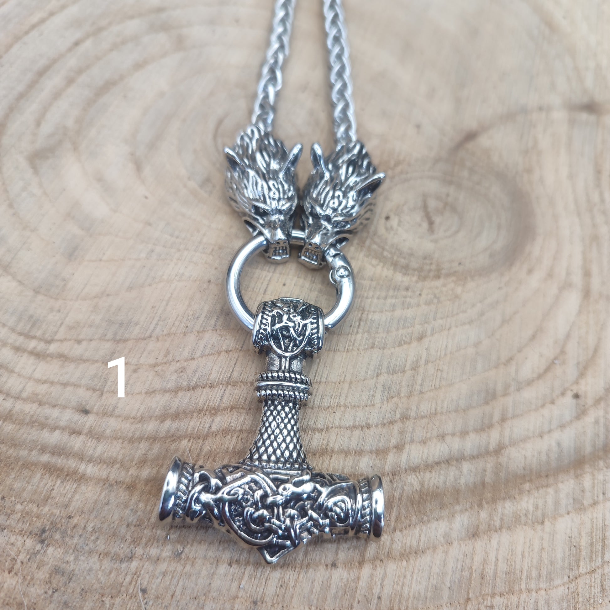 The necklace stands out with its unique clasp: two detailed wolf heads (inspired by Geri and Freki, Odin's loyal guardians) that guard the central ring. This combination evokes the balance between the raw power of thunder and the loyal cunning of the wolf, representing the audacity and bravery of the true northern warrior.