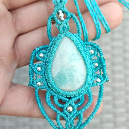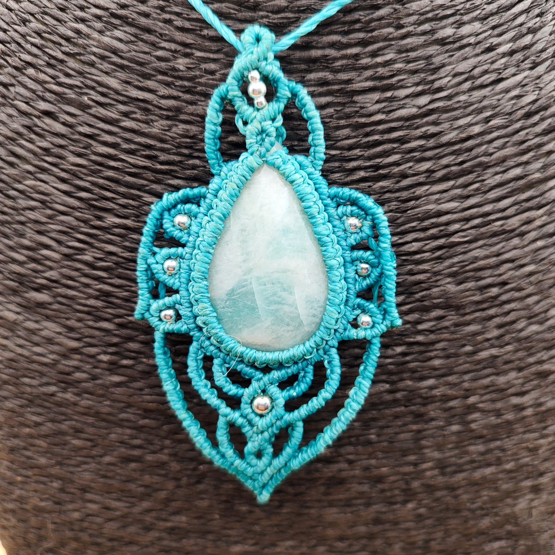 Para estar a la altura de esta gema, hemos diseñado un marco de micro-macramé de alta complejidad en tono azul turquesa, salpicado con bolitas de Plata de Ley que aportan destellos de luz y elegancia. Un diseño orgánico y majestuoso que abraza la piedra con precisión artesanal.