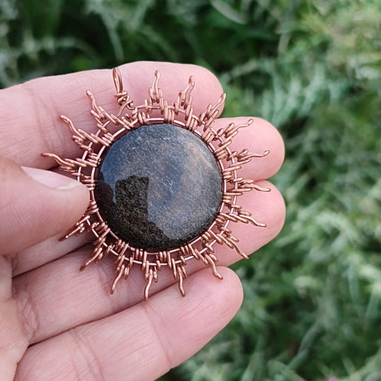 Déjate cautivar por el colgante "Sol de Eclipse", una pieza que celebra la dualidad entre la luz y la sombra. En el centro de un sol forjado a mano en cobre natural, descansa una Obsidiana Dorada de brillo hipnótico. A simple vista, su elegancia oscura destaca sobre el metal, pero bajo la luz del sol, revela un destello dorado interno que parece una galaxia lejana.