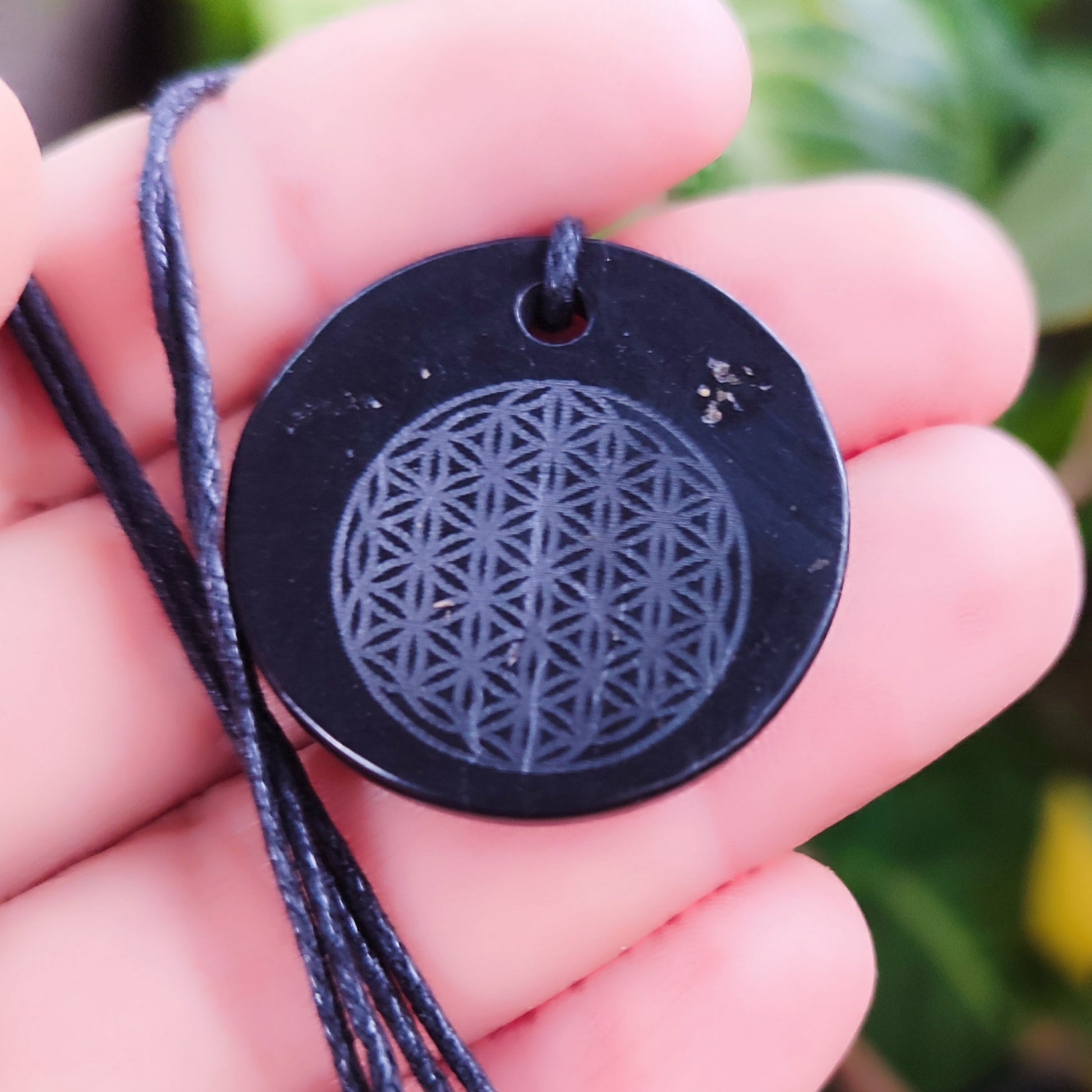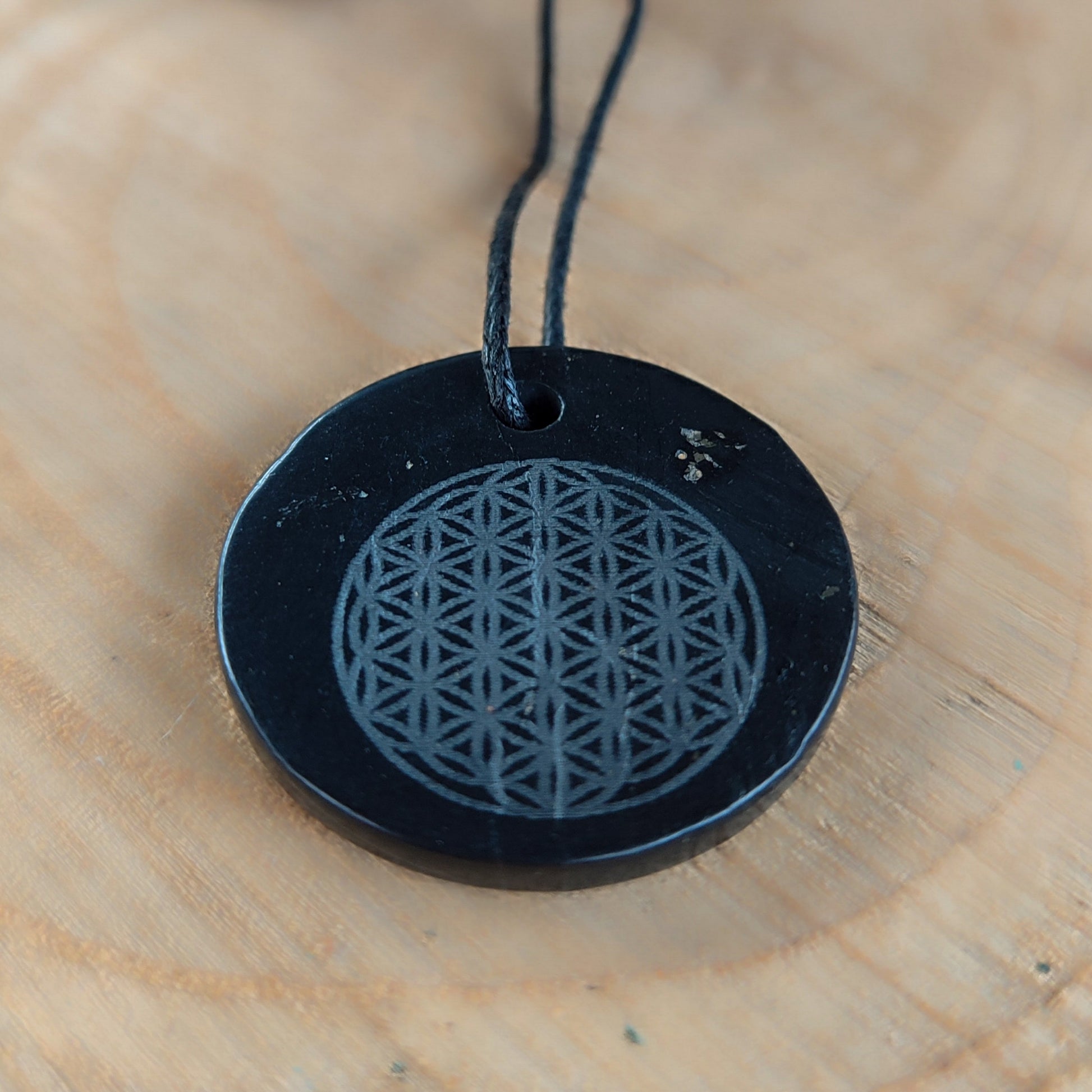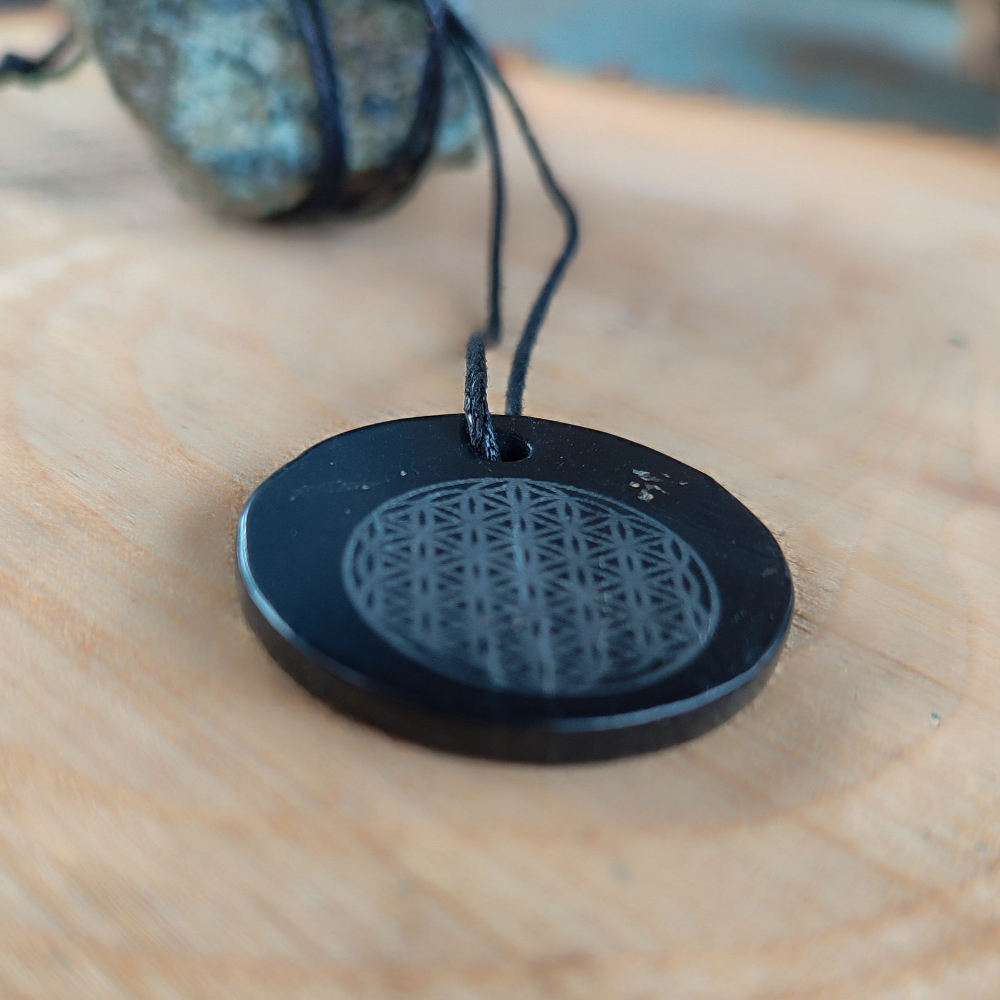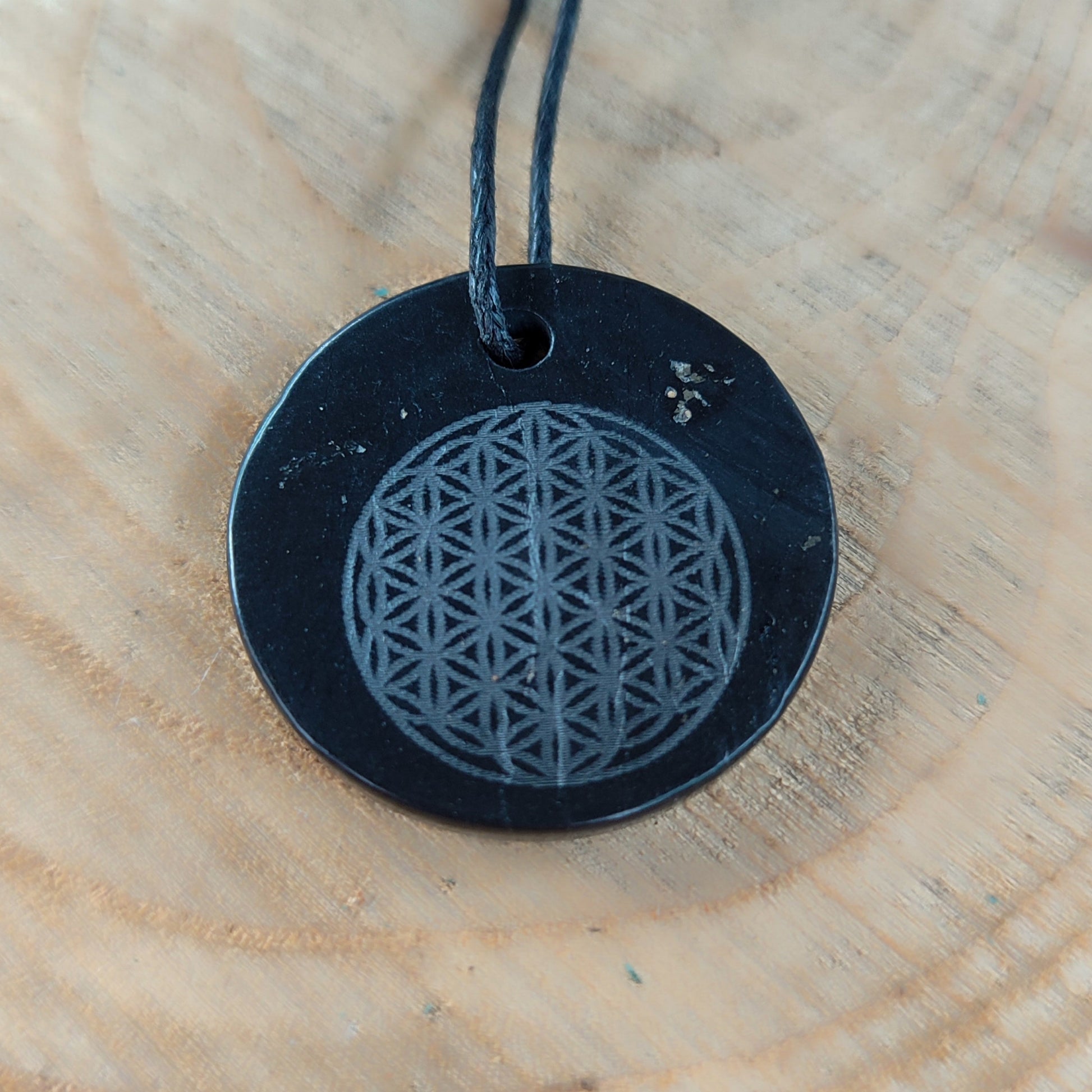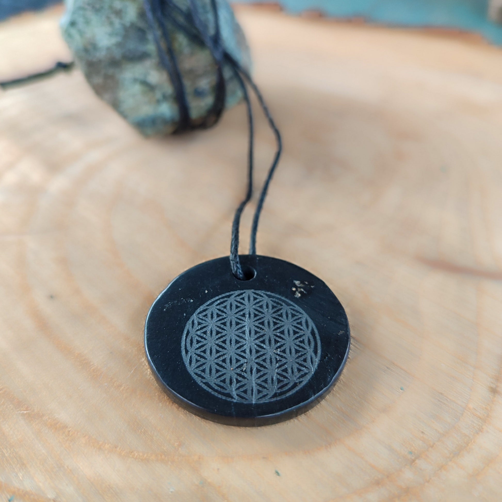 Descubre el colgante de shungita tallada con la flor de la vida, tu nuevo amuleto energético. Alivia dolores, protege contra las ondas de 5G y wifi, y mantiene tu aura limpia y equilibrada. Perfecto para recargar energías, eliminar negatividad y purificar el agua, además de ayudarte a encontrar tu camino con estilo y buena vibra. ¡Llévalo siempre contigo y siente la diferencia!