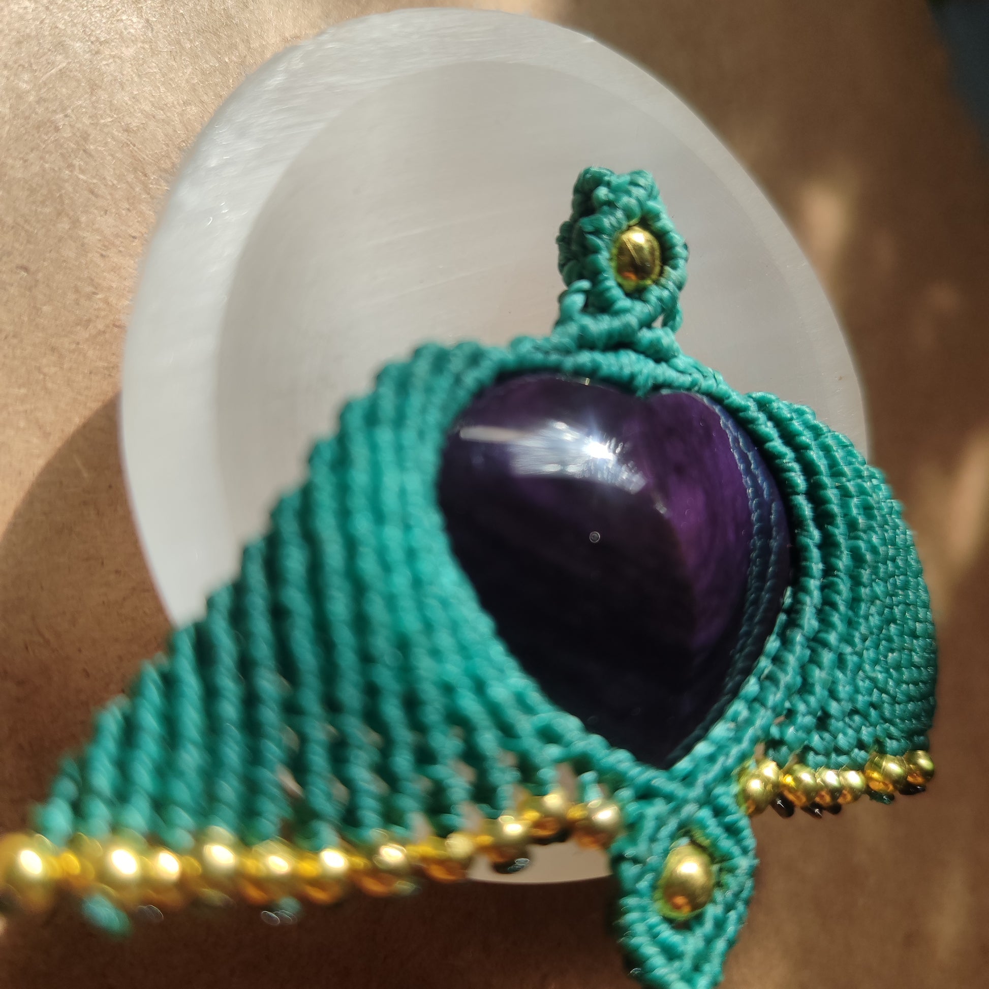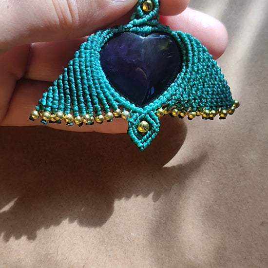 Colgante de obsidiana manto Huichol con forma de corazón alado que abraza un yin yan en su centro. Tejido en macramé con hilo verde azulado, estas alas susurran la verdad más antigua: el corazón siempre debe ser libre. Un amuleto para los espíritus aventureros que se niegan a estar atados, llevando la magia del equilibrio y la libertad en cada latido.