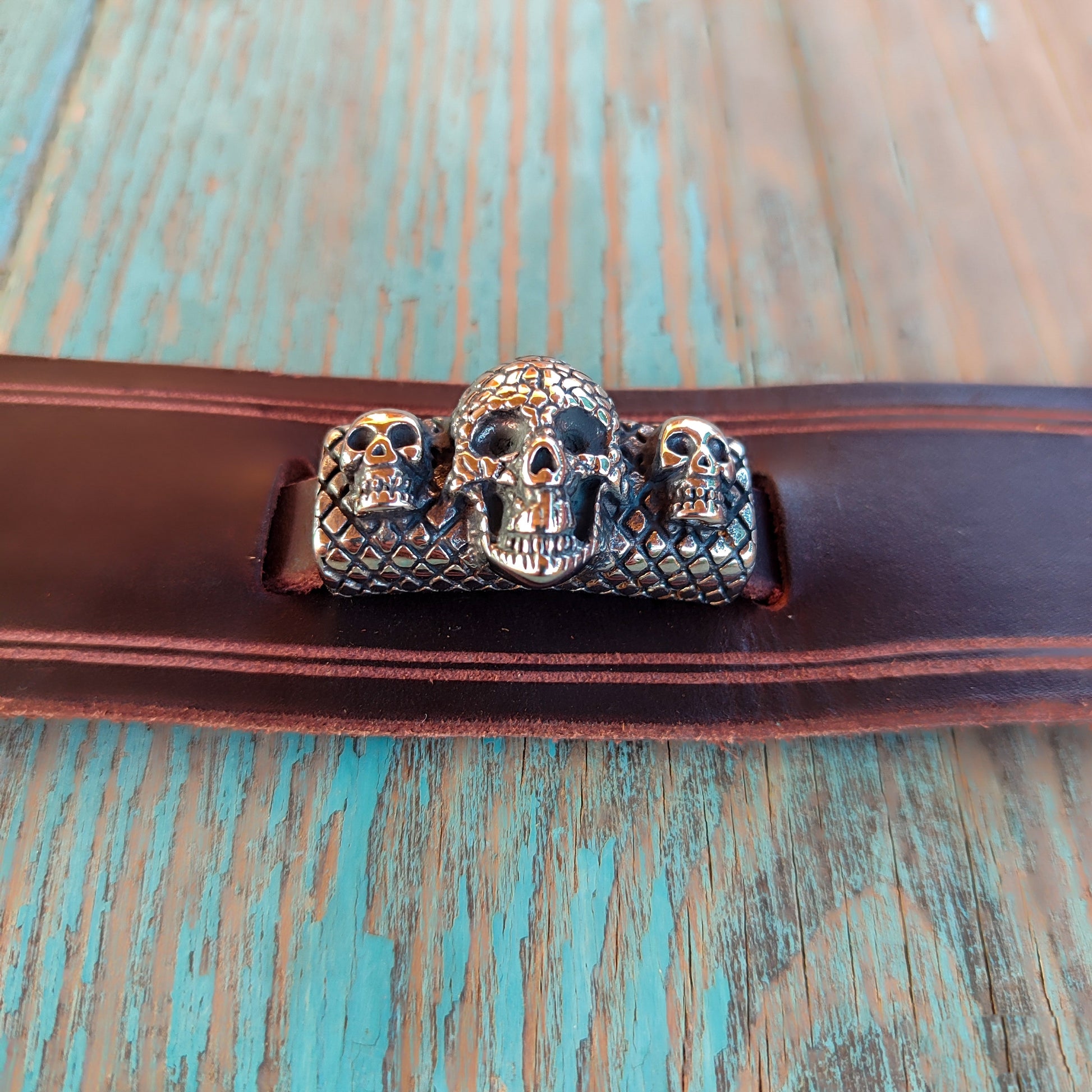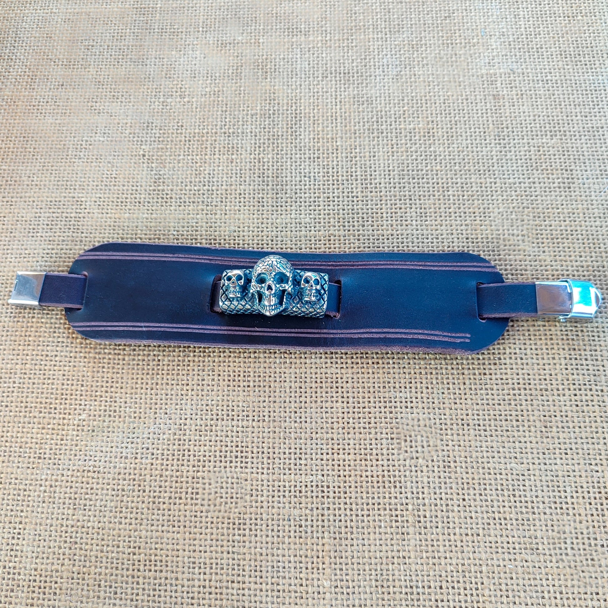 Pulsera ancha de cuero con tres calaveras de acero que combina estilo y versatilidad. Ajustable fácilmente por ti mismo, o si lo prefieres, indícanos el contorno de tu muñeca en cm durante el pago (apartado de instrucciones) y te la enviamos lista para estrenar. Diseño atrevido y cómodo para quienes no temen destacar.